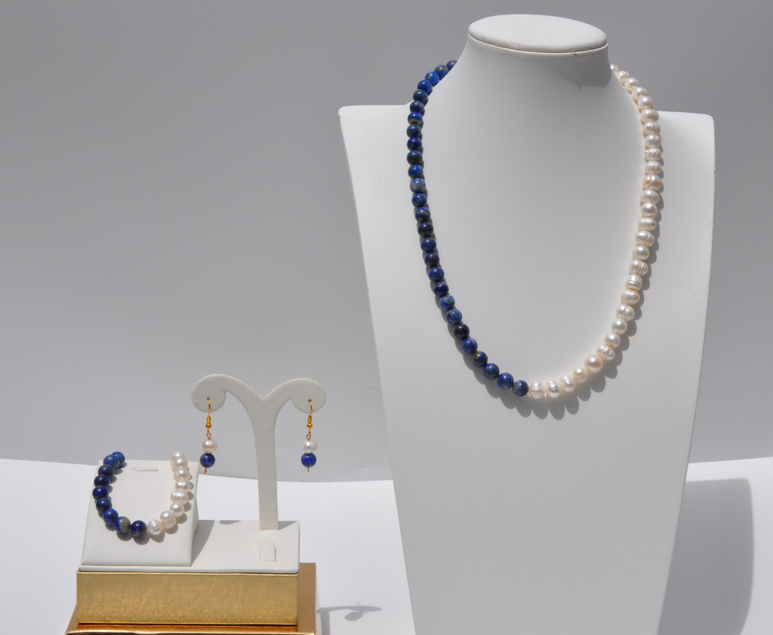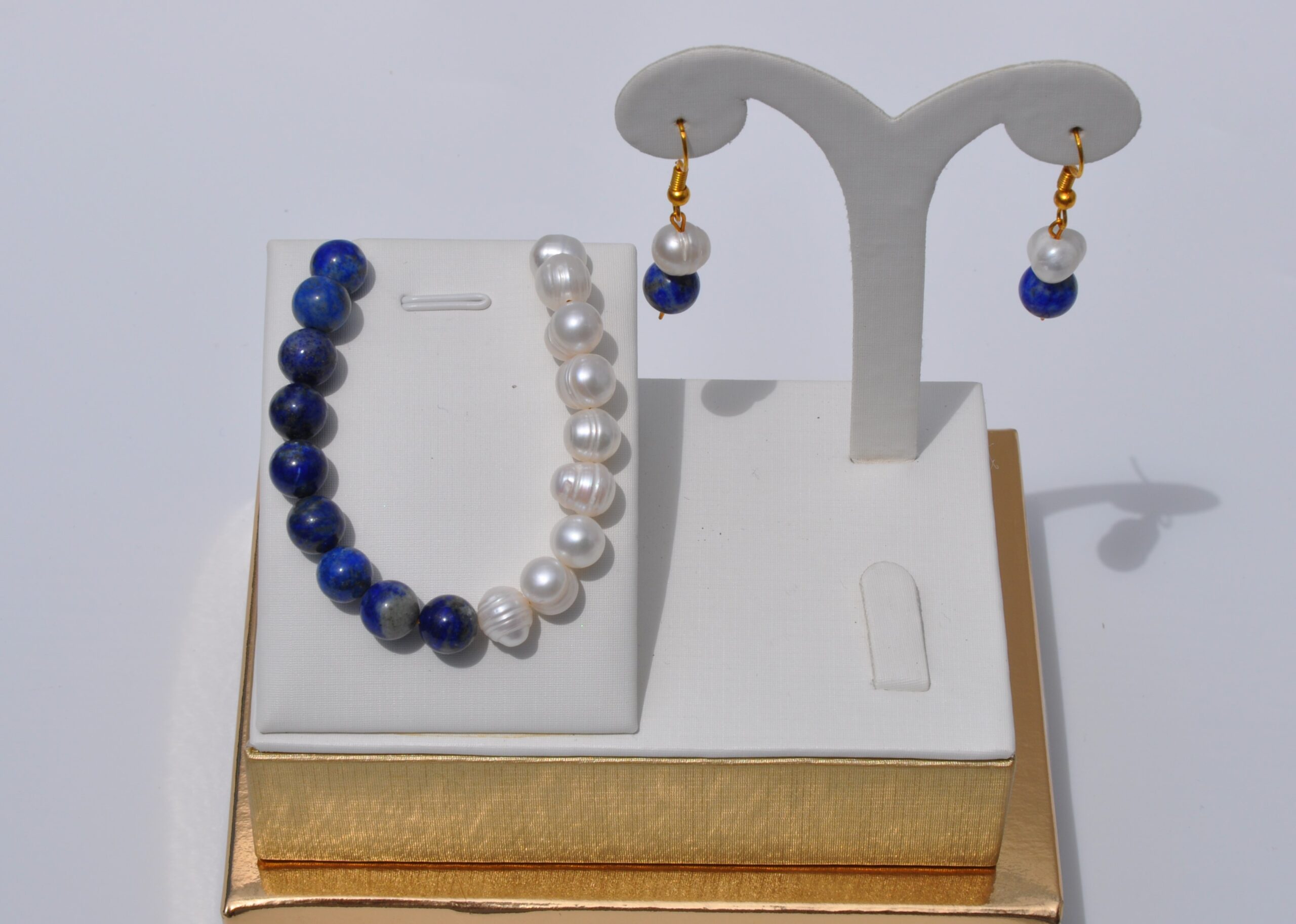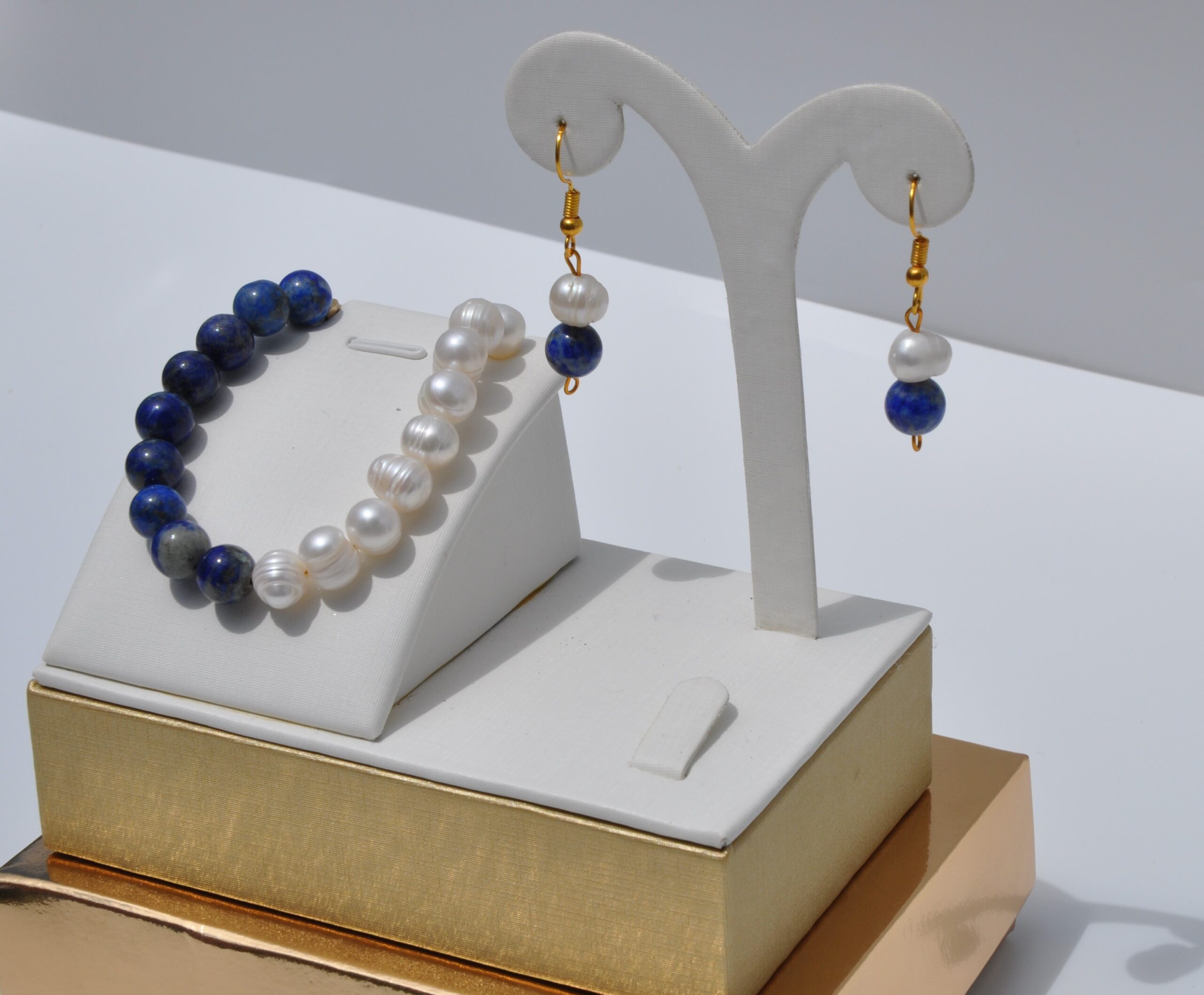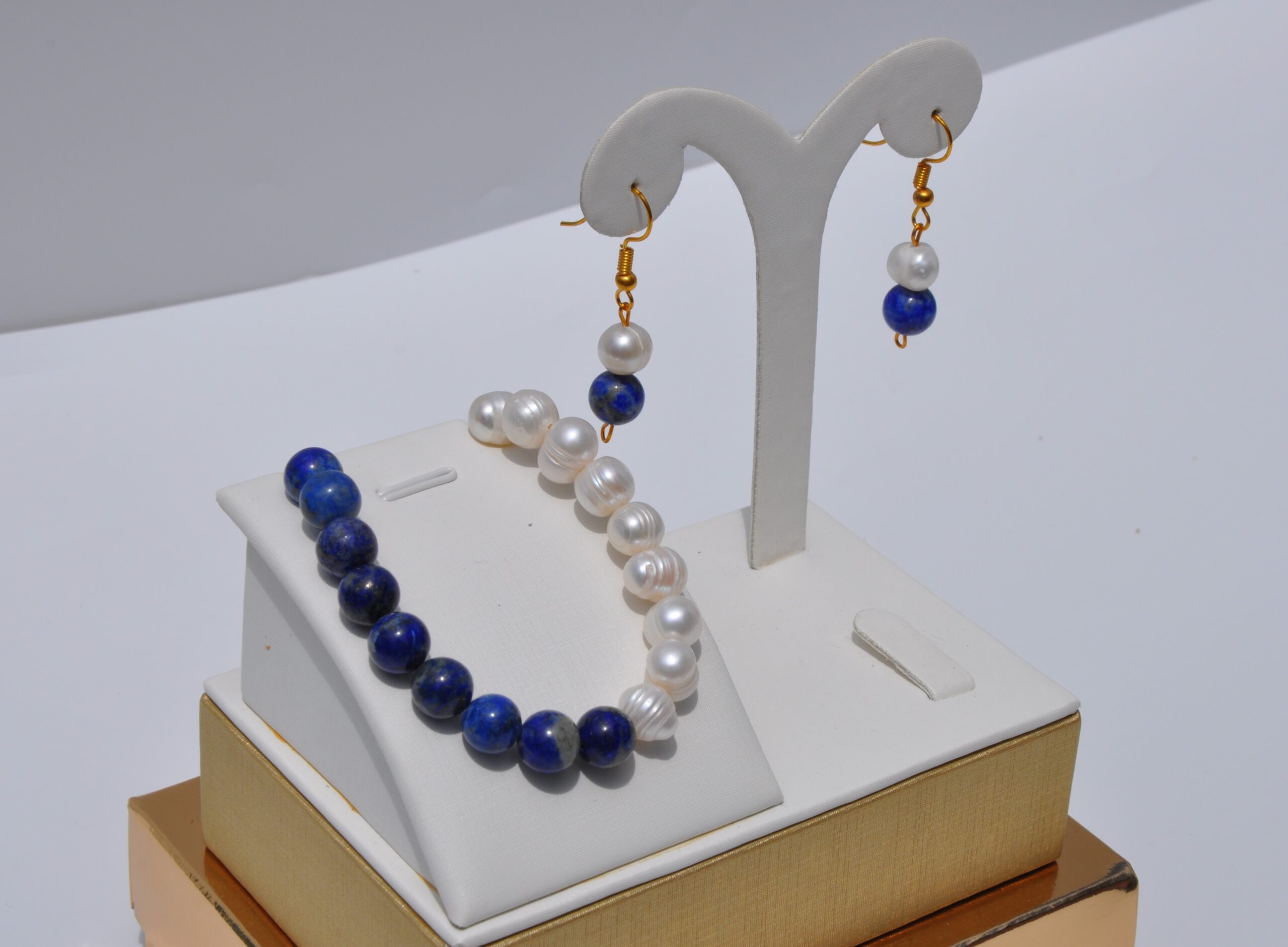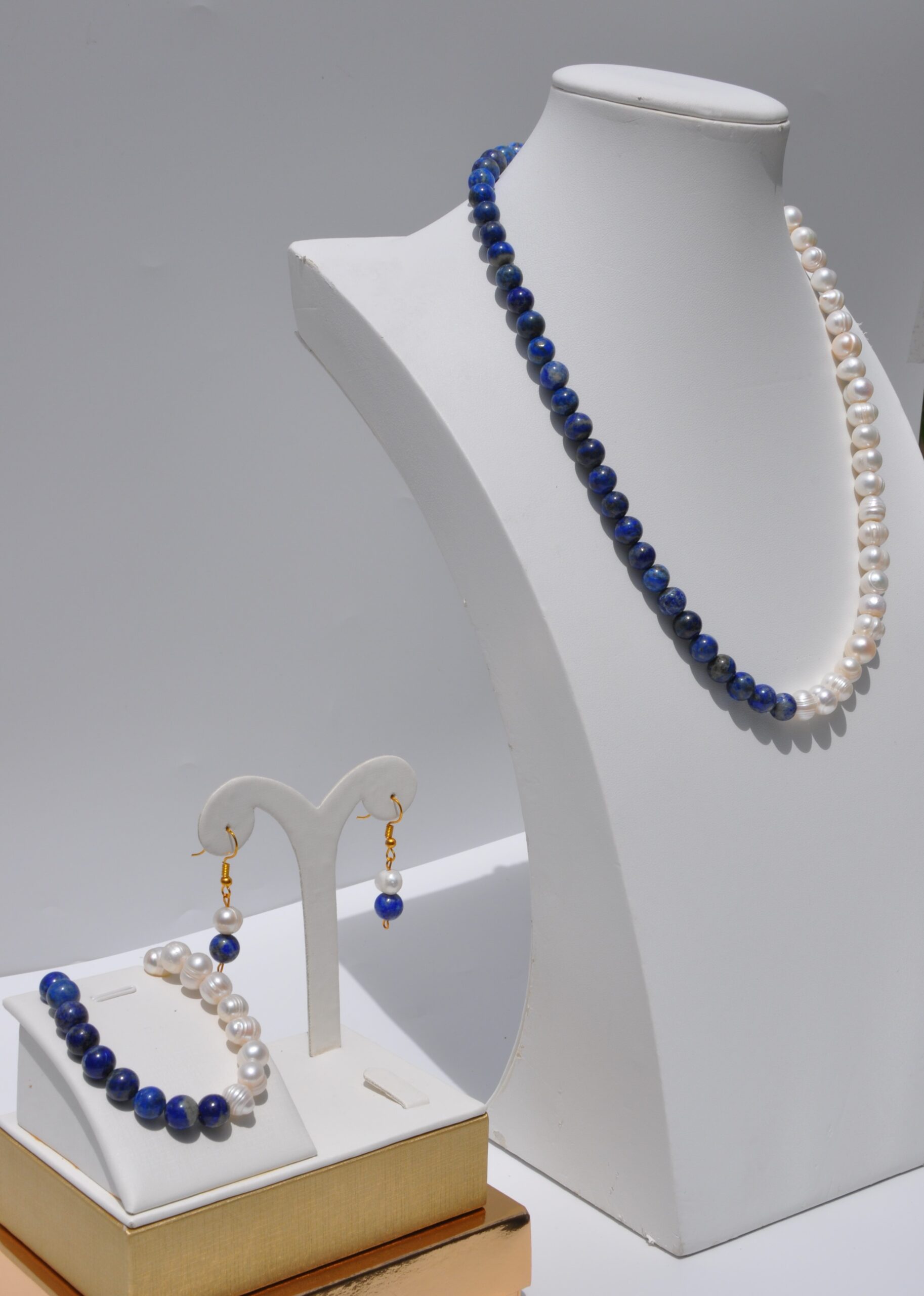 İnci ve Lapis lazuli Doğal Taş Kolye Bileklik ve Küpe Seti